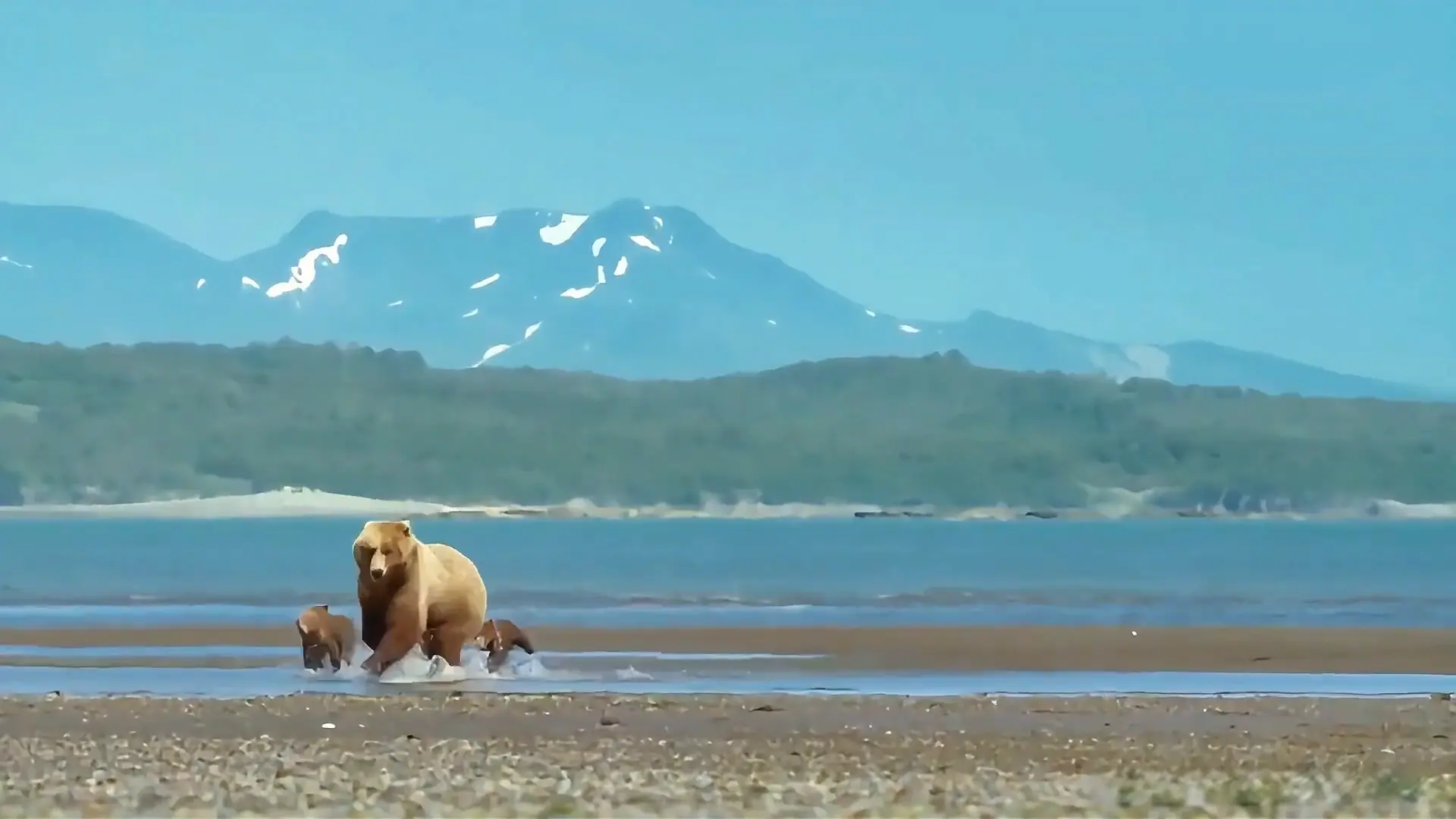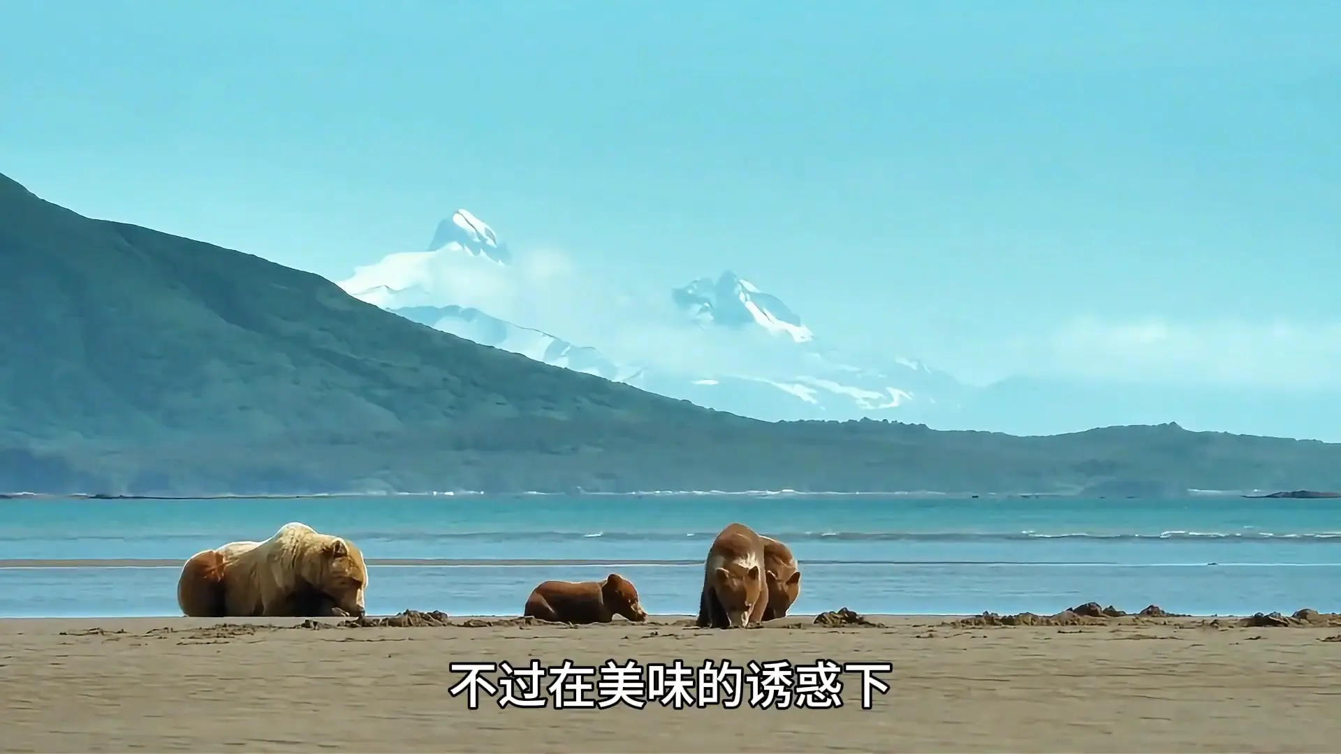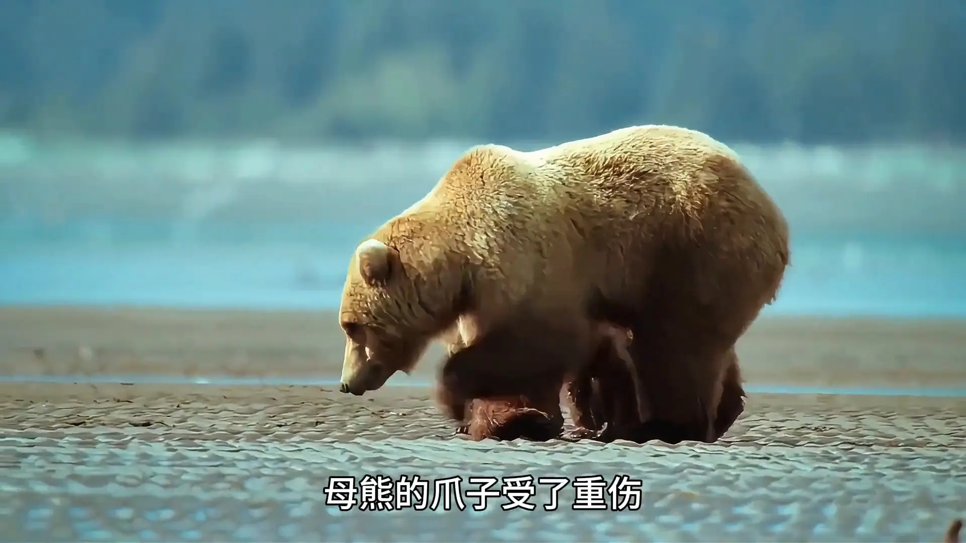 母熊一瘸一拐的带着孩子们朝滩涂走去。这几个小家伙第一次见到大海,满是好奇。它们趟过浅水来到了浅滩中央,母熊的爪子受了重伤,但它那灵敏的鼻子早已嗅到泥土里的美味。只见它用左爪轻轻一挖,就刨出了美食蛤蜊。母熊迫不及待的吃了起来,没吃到第一口的幼崽似乎有点不满。
