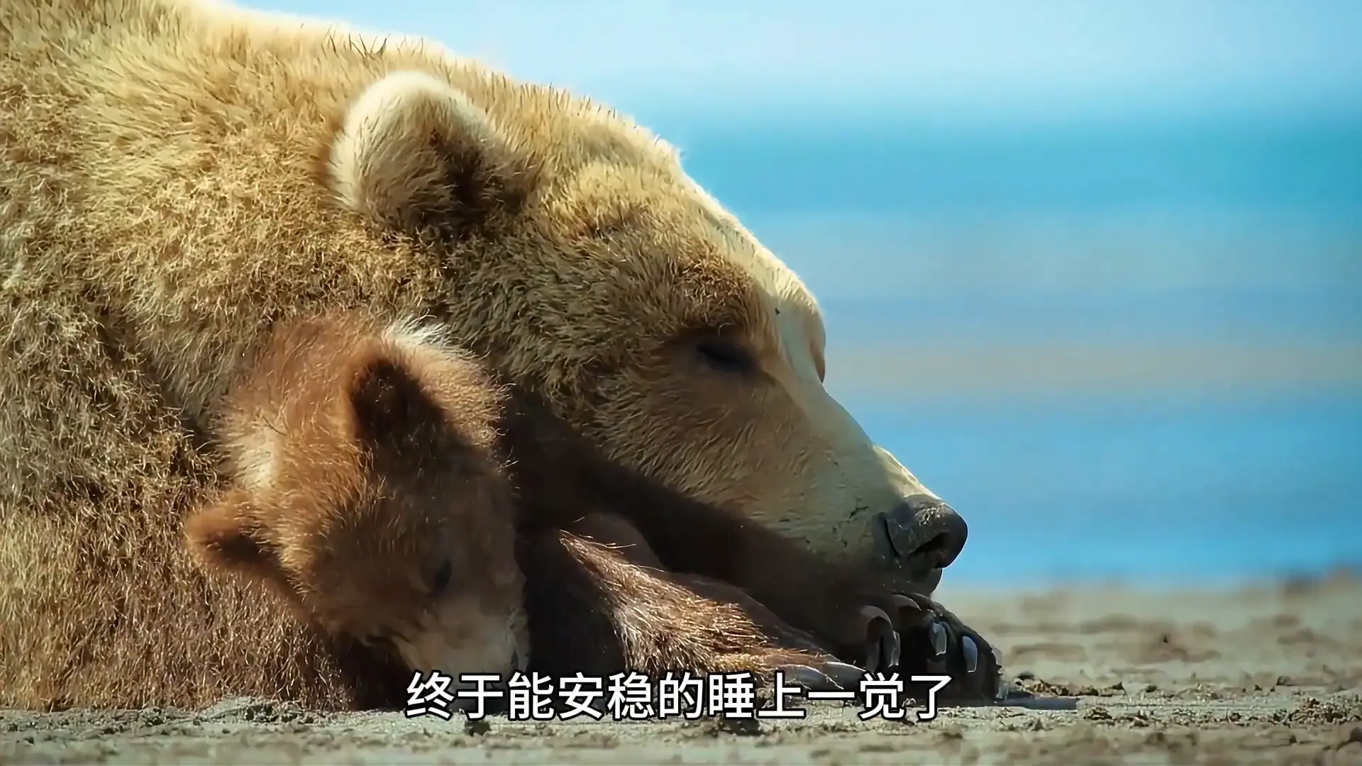 蛤蜊虽小,却十分鲜美可口。母熊不停的挖不停的吃,幼崽们只能捡剩下的残羹解解馋。不过在美味的诱惑下,它们很快就学会了抛开泥沙,大快朵颐起来。吃饱了还得喝好,慈祥的母熊仰起胸膛,几只幼崽满足的吸吮着母亲的乳汁。吃饱喝足后,它们睡起了午觉,母熊和它的孩子们终于能安稳的睡上一觉了。