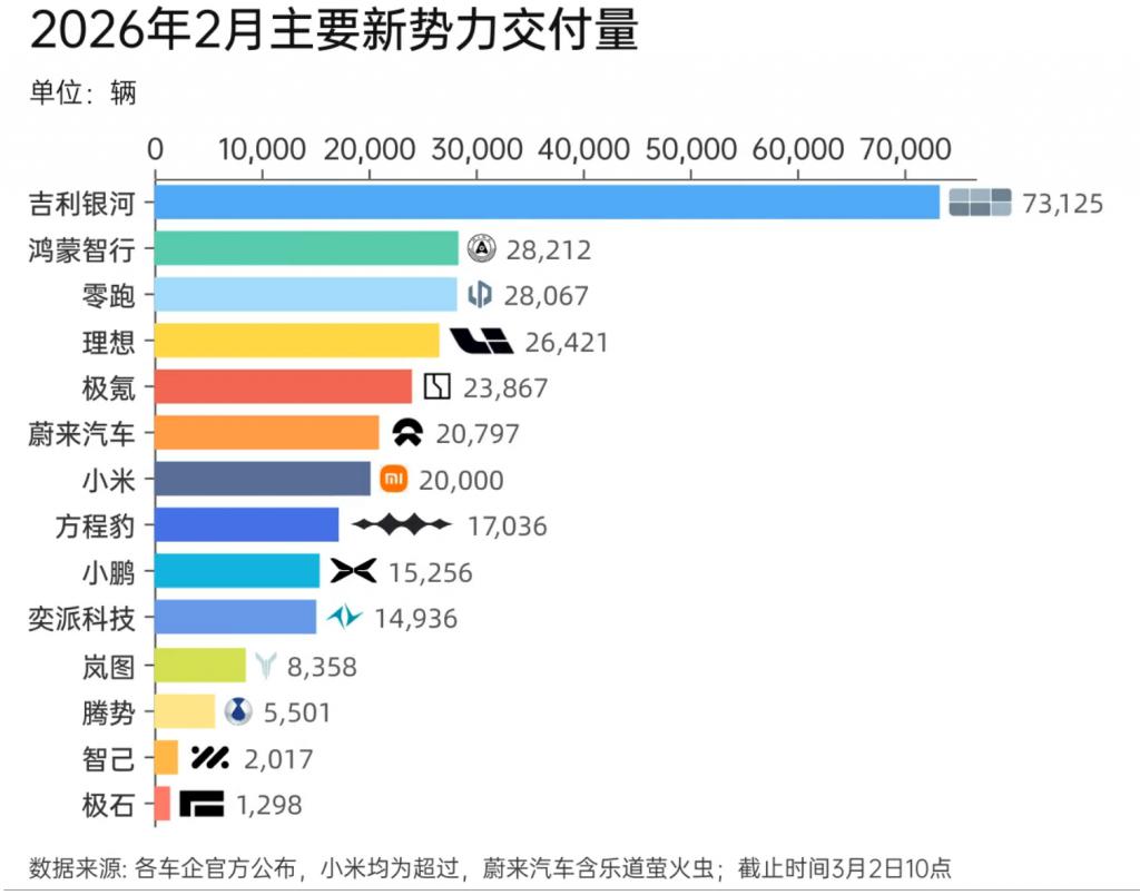 由此把视线聚焦在另一位车圈流量担当小米身上,2 月交付新车仅超 2 万辆,乍一看确实有些大跌眼镜。但静下来一想,在新款 SU7 尚未补位,YU7 储备订单逐渐被消耗的基础上,又显得情有可原。
