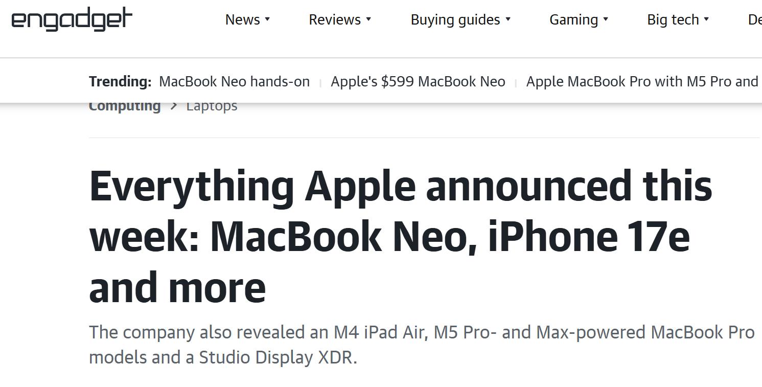 【环球网科技综合报道】3月5日消息,据engadget报道称,本周苹果公司迎来了其历史上最为密集的产品发布周。从周一的iPhone 17e与iPad Air M4,到周二全面更新的MacBook Pro、MacBook Air及Studio Display系列,再到周三正式揭晓的入门级笔记本电脑MacBook Neo,苹果在短短三天内推出了六款全新或升级设备,全方位覆盖了从入门消费级到顶级专业级的市场需求。