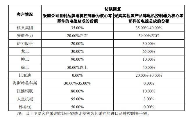 其在回复北交所问询函时表示,当前主要下游客户采购公司自制品牌电机控制器为核心零部件的电控总成占其所有采购份额的比例基本在20%至50%之间,其中柳工、江淮银联及太重机械向公司的采购份额占比超80%。