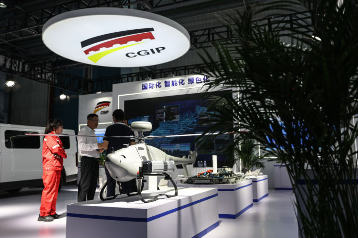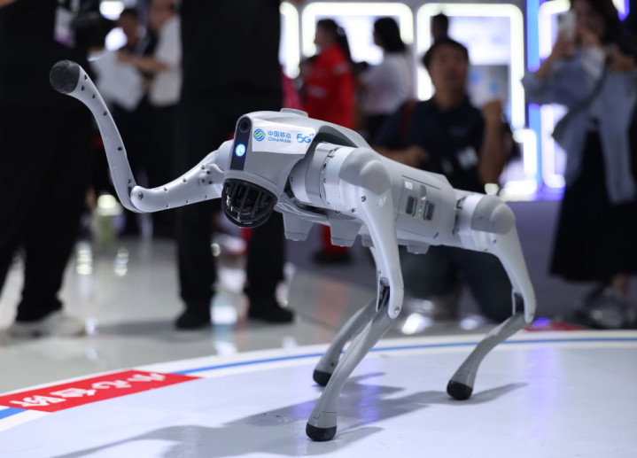 ↑9月6日,一个奔跑的机器人吸引观众驻足观望。新华社记者周华摄
