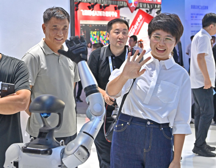 ↑9月6日,观众在2025全球工业互联网大会现场与机器人互动。新华社记者周华摄